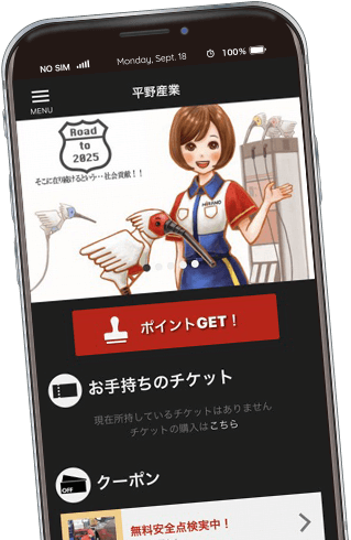 平野産業公式アプリでは、来店ポイントをはじめ、ユーザー限定のお得なクーポンの配信や、イベント情報、新着情報などの発信を行っています。